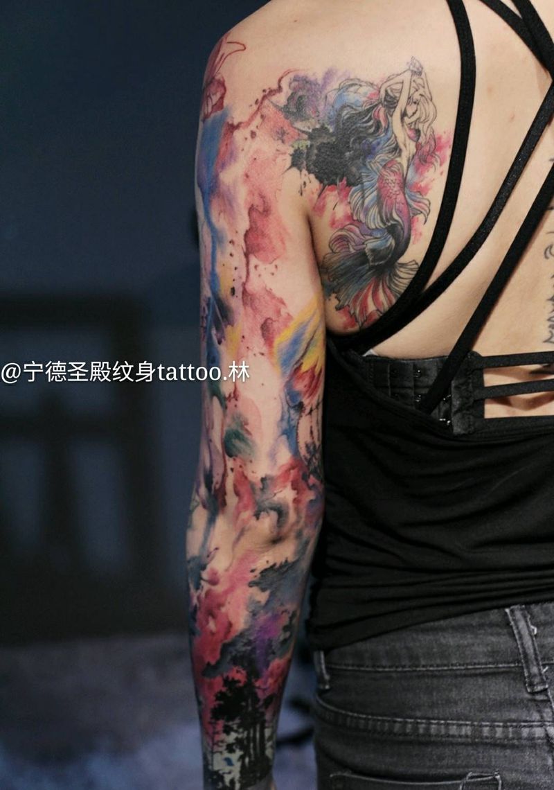 当前位置: 首页 >福建省宁德市纹身店-宁德圣殿纹身纹身图案>水彩印象风花臂纹身图片