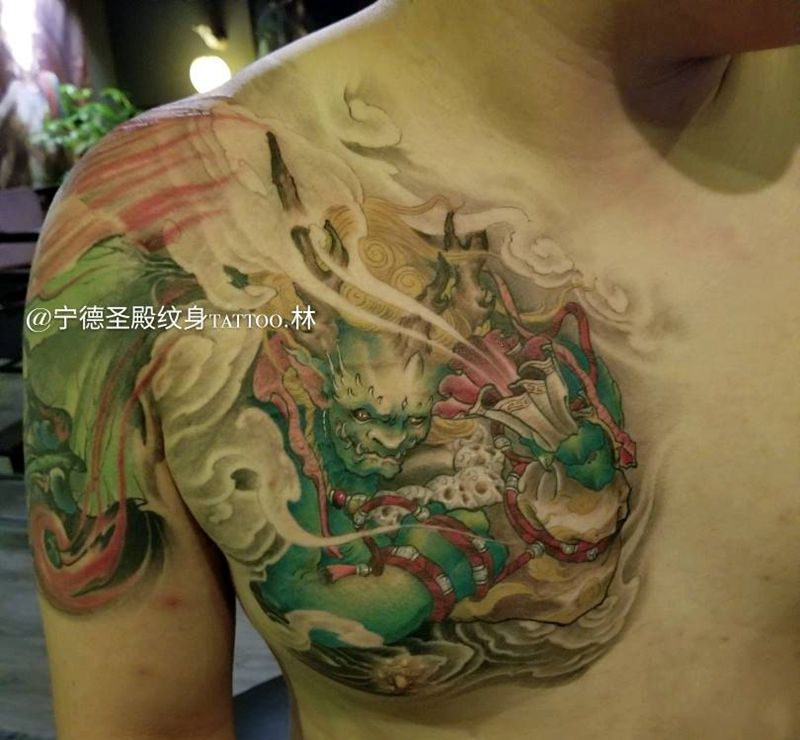 当前位置: 首页 >福建省宁德市纹身店-宁德圣殿纹身纹身图案>风神唐狮半甲纹身图片