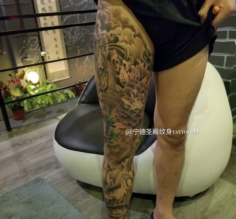 • T网红王老大花腿龙纹身图片_腿部新传统纹身图案