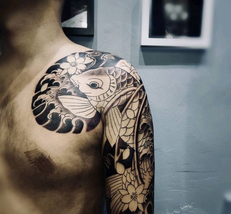 日式大锦鲤纹身图片_胸部手臂老传统鱼樱花浪纹身图案