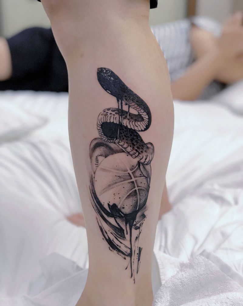 当前位置: 首页 >江西省南昌市纹身店-雕杰刺青工作室纹身图案>黑曼巴纹身图片_腿部脚部水墨点刺纹身图案