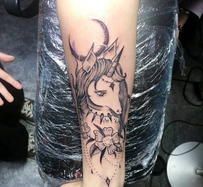 当前位置: 首页 >江西省南昌市纹身店-雕杰刺青工作室纹身图案>情侣款独角兽纹身图片_手臂手部点刺老传统纹身图案