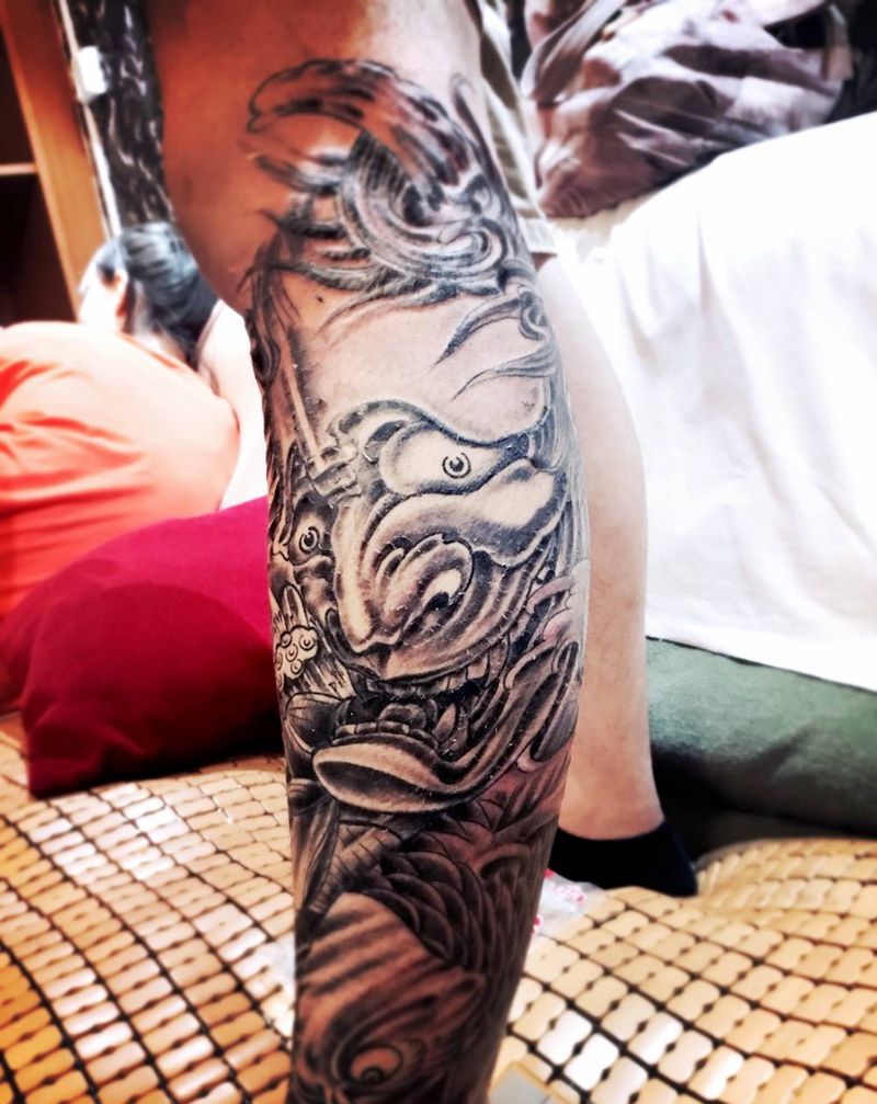• T网红王老大花腿龙纹身图片_腿部新传统纹身图案