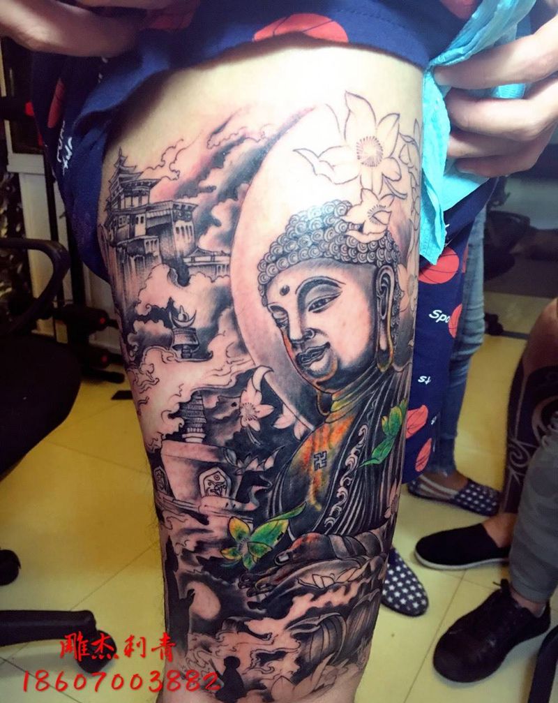 当前位置: 首页 >江西省南昌市纹身店-雕杰刺青工作室纹身图案>旧纹身遮盖纹身图片_成品腿部传统肖像人物鬼神宗教纹身图案