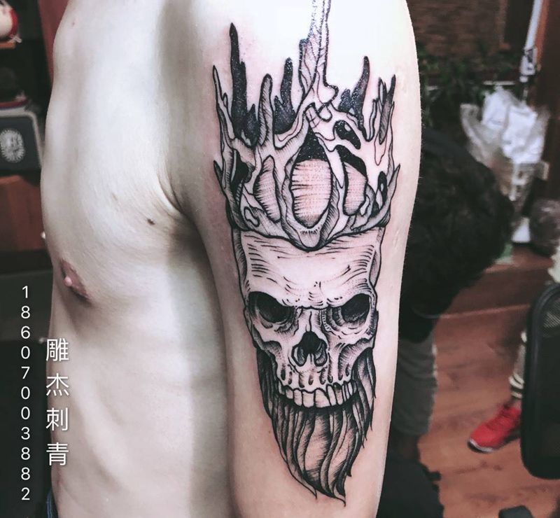 当前位置: 首页 >江西省南昌市纹身店-雕杰刺青工作室纹身图案>单针骷髅纹身图片_手臂欧美写实点刺纹身图案