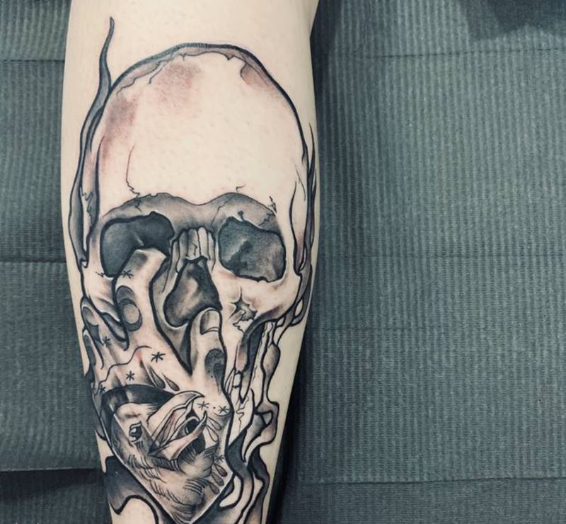 当前位置: 首页 >江西省南昌市纹身店-帝一刺青纹身图案>骷髅纹身图片_腿部手臂New School纹身图案