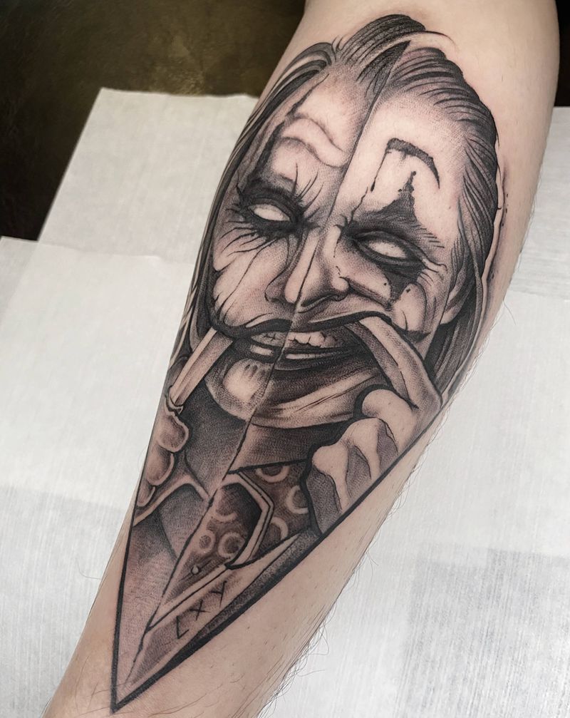 当前位置: 首页 >江西省南昌市纹身店-Z.TATTOO纹身图案>小丑纹身图片_腿部欧美写实纹身图案