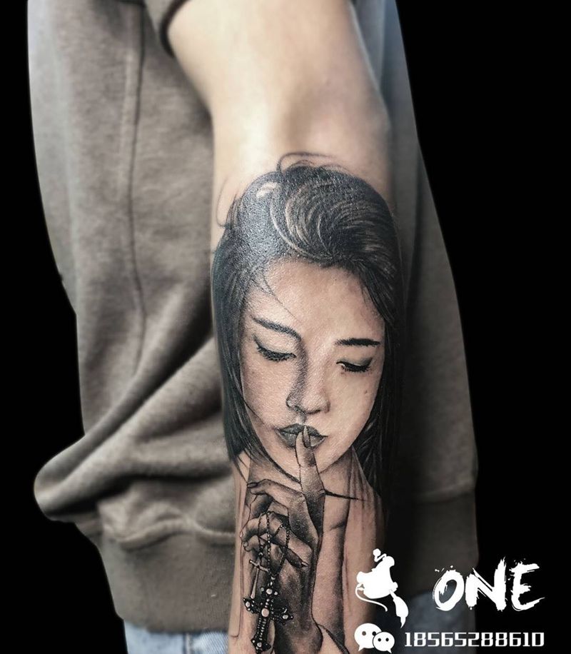 当前位置: 首页 >江西省南昌市纹身店-ONE 纹身纹身图案>祈祷的少女纹身图片_手臂手部欧美写实美女肖像十字架纹身图案