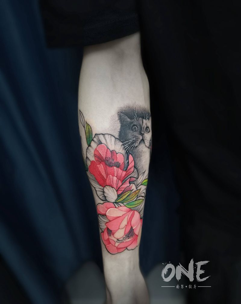 当前位置: 首页 >江西省南昌市纹身店-ONE 纹身纹身图案>猫咪素花素描纹身图片_手臂手部点刺欧美写实素描猫素花彩色纹身图案