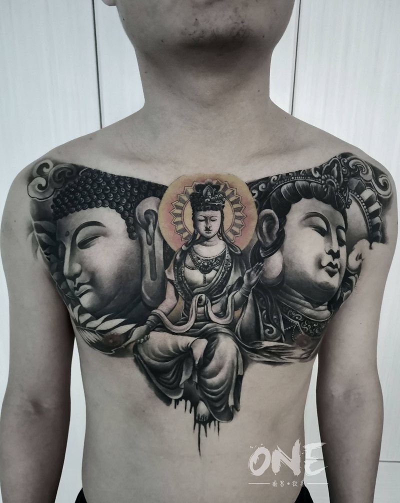 三面佛纹身图片_胸部新传统欧美写实三面佛佛像花胸纹身图案