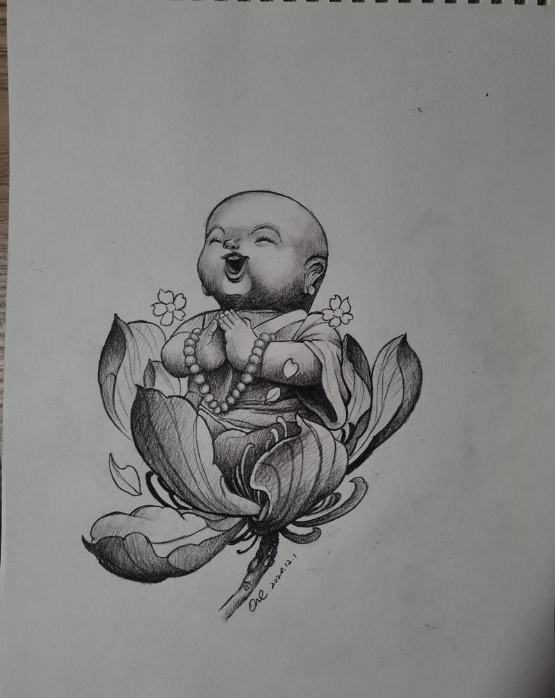 手绘小佛一枚纹身图片_手臂新传统荷花佛佛手稿可爱佛纹身图案