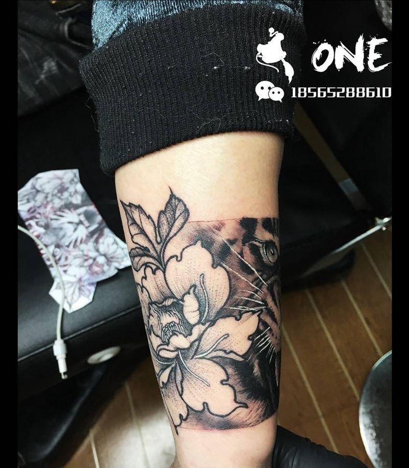 老虎手环纹身图片_手部手臂欧美写实点刺老虎写实素花纹身图案