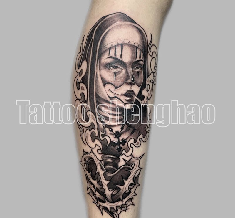 当前位置: 首页 >江西省南昌市纹身店-鸿刺青纹身图案>Chicano女郎纹身图片_腿部欧美写实修女奇卡诺女郎纹身图案
