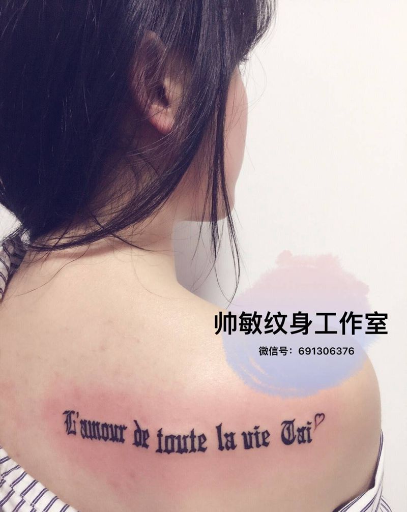 当前位置: 首页 >江西省九江市纹身店-帅敏纹身工作室纹身图案>法文纹身图片_胸部背部清新字符情侣帅敏TATO纹身图案