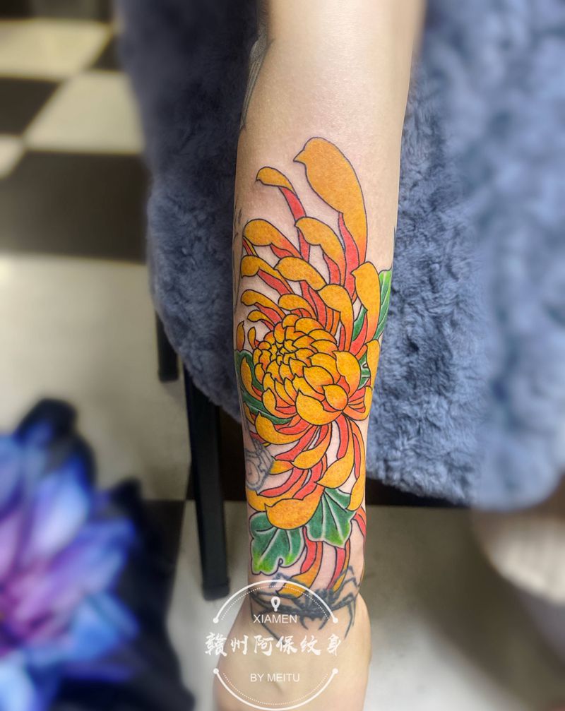 当前位置: 首页 >江西省赣州市纹身店-赣州阿保纹身纹身图案>菊花纹身图片_手臂老传统纹身图案