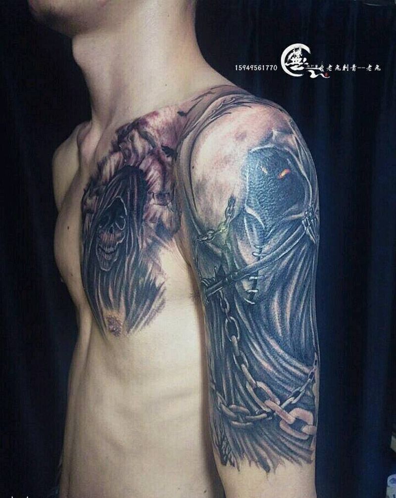 当前位置: 首页 >江西省九江市纹身店-無相纹图老鬼刺青纹身图案>死神纹身图片_胸部手臂欧美成品纹身图案