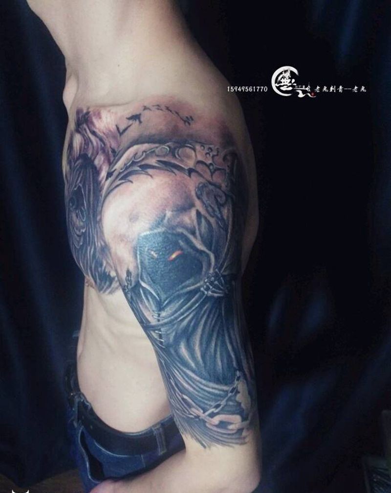 当前位置: 首页 >江西省九江市纹身店-無相纹图老鬼刺青纹身图案>死神纹身图片_胸部手臂欧美成品纹身图案