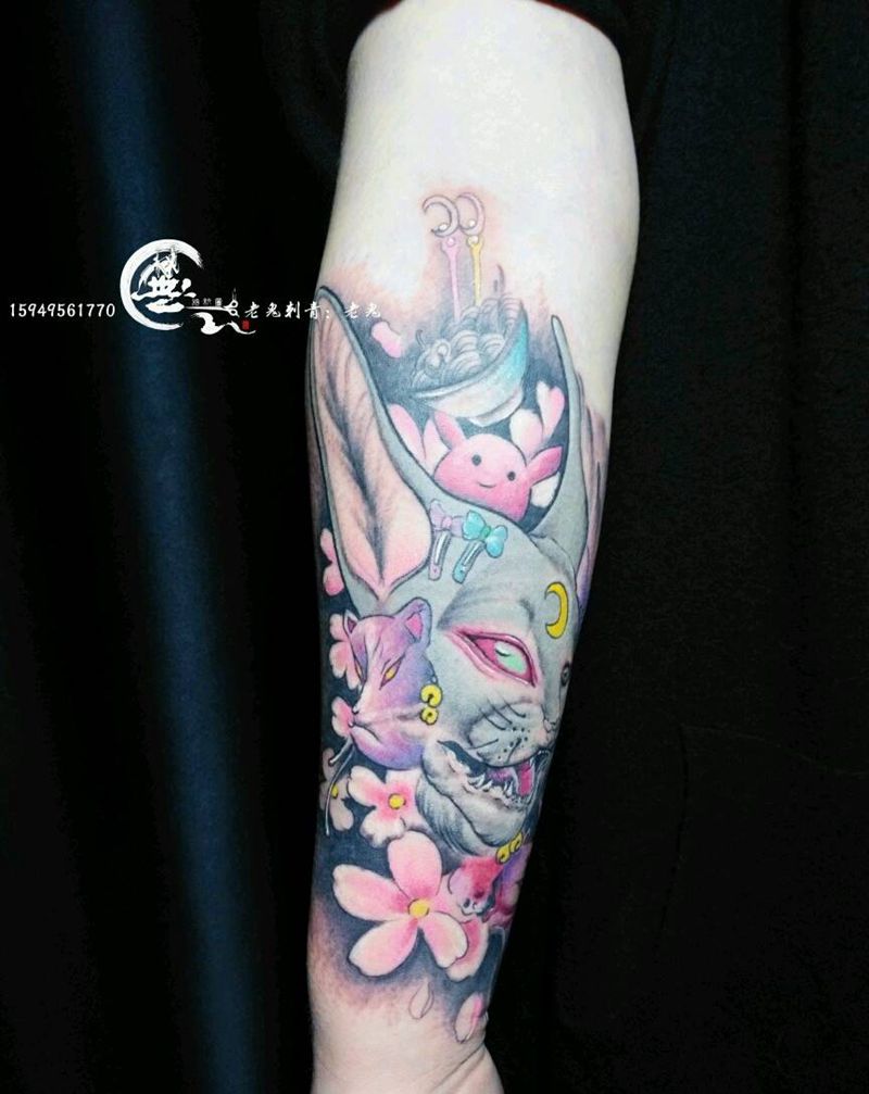 美丽邪恶的猫纹身图片_手臂水彩成品纹身图案