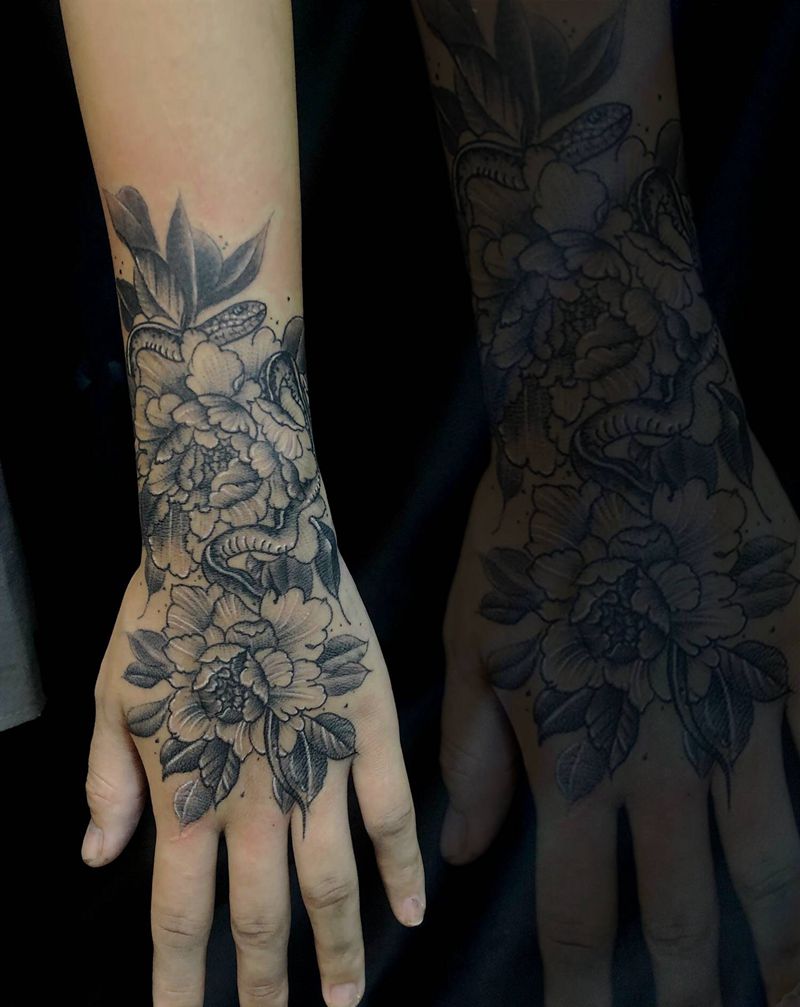 当前位置: 首页 >江西省赣州市纹身店-南康忠义堂纹身机构纹身图案>手背素花纹身图片_手部点刺纹身图案