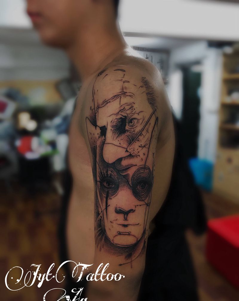 当前位置: 首页 >江西省上饶市纹身店-聚艺堂·刺青-阿光工作室纹身图案>小丑纹身图片_手臂点刺Old School纹身图案