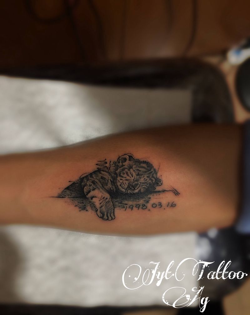 当前位置: 首页 >江西省上饶市纹身店-聚艺堂·刺青-阿光工作室纹身图案>奶奶的小幼虎纹身图片_手臂几何点刺纹身图案