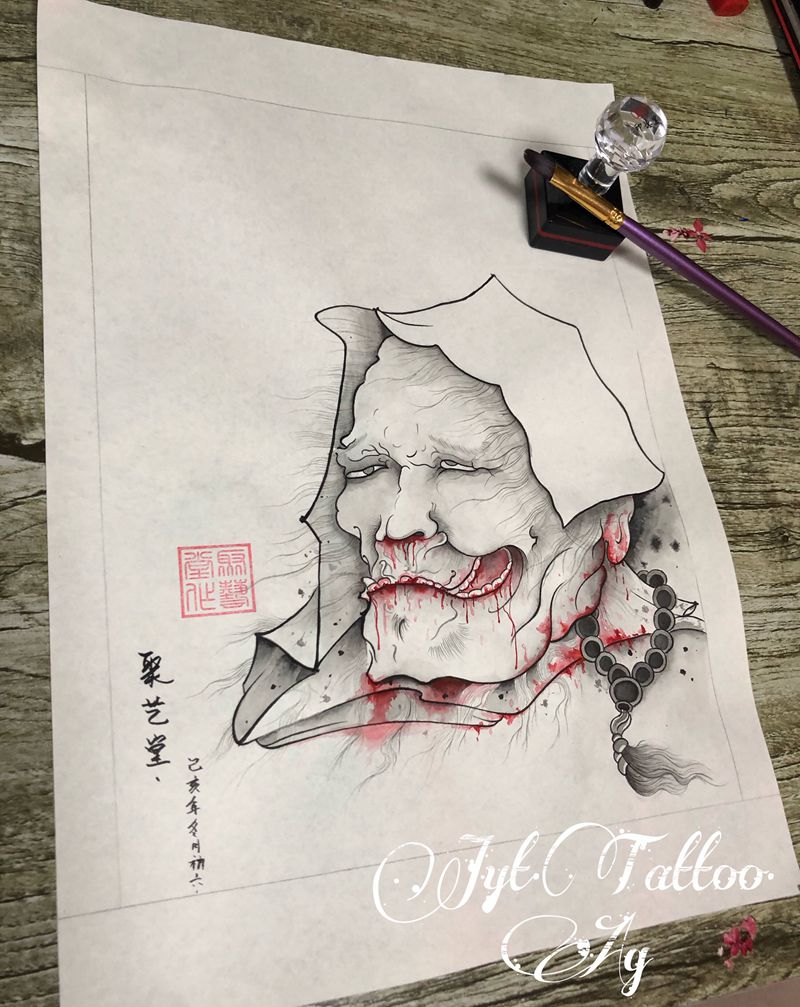 当前位置: 首页 >江西省上饶市纹身店-聚艺堂·刺青-阿光工作室纹身图案>鬼首纹身图片_水墨老传统纹身图案