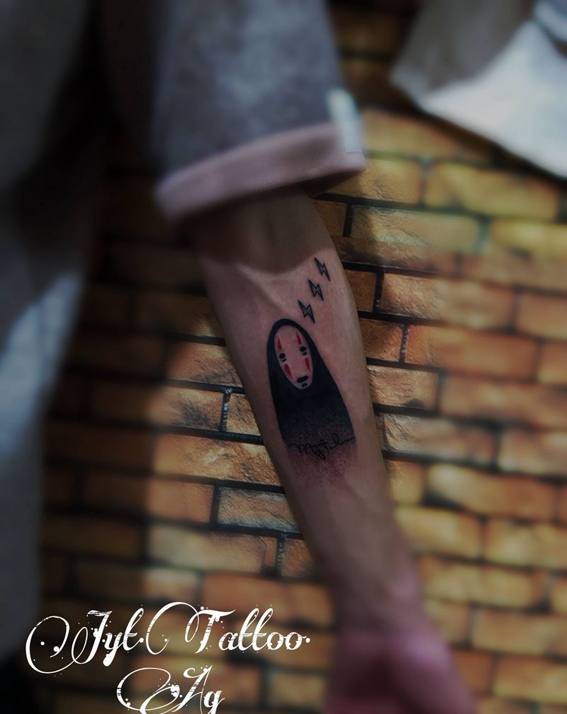 当前位置: 首页 >江西省上饶市纹身店-聚艺堂·刺青-阿光工作室纹身图案>无脸男加英文纹身图片_手臂Old SchoolNew School纹身图案