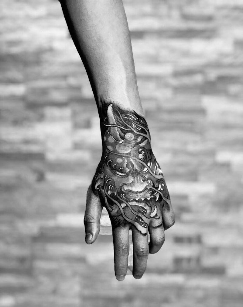 谛听兽纹身图片_手部新传统手背上饶呀呀刺青纹身图案