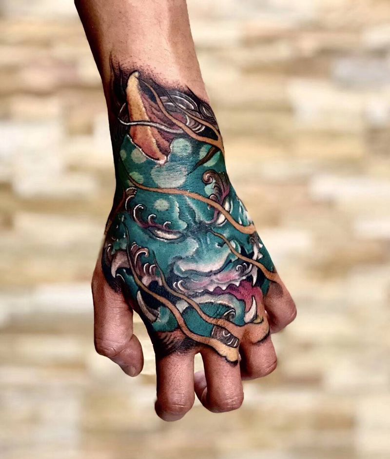 谛听兽纹身图片_手部新传统手背上饶呀呀刺青纹身图案