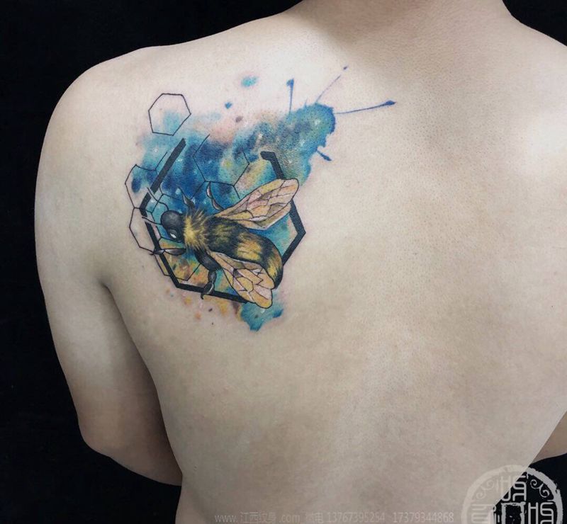 水彩几何honeybee纹身图片_背部水彩几何纹身图案