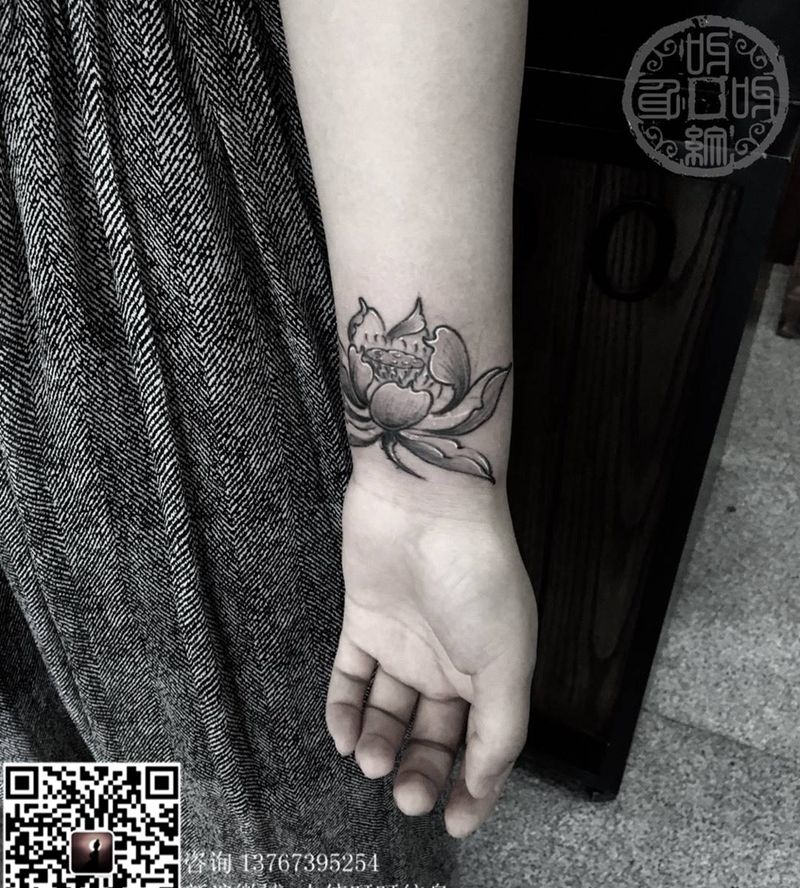 手腕莲花纹身图片_成品手部手臂传统写实国画植物呀呀刺青纹身图案