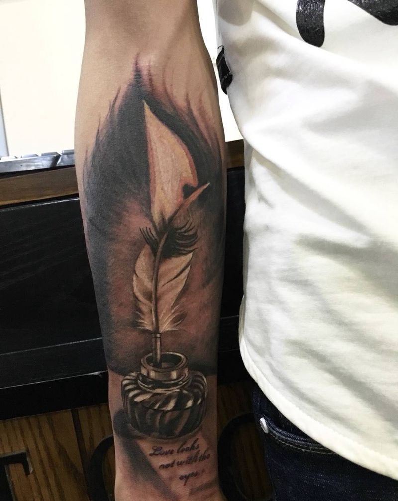 羽毛笔纹身图片_成品手部手臂写实传统欧美静物呀呀刺青纹身图案