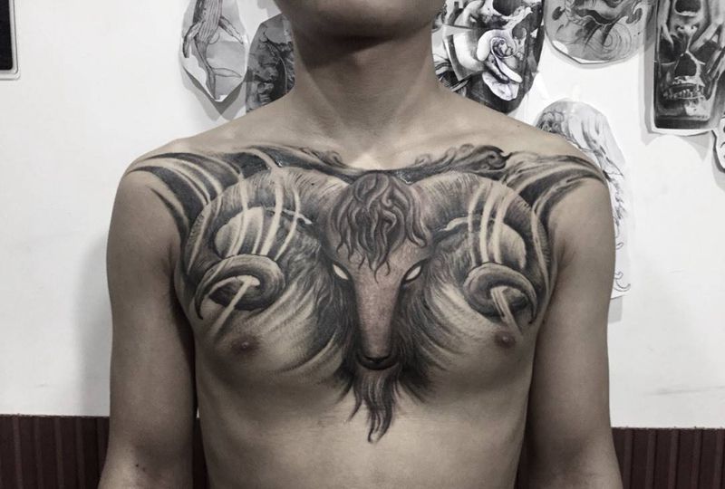 当前位置: 首页 >江西省上饶市纹身店-呀呀刺青纹身图案>羊头纹身图片_成品胸部肩部传统写实欧美呀呀刺青动物纹身图案
