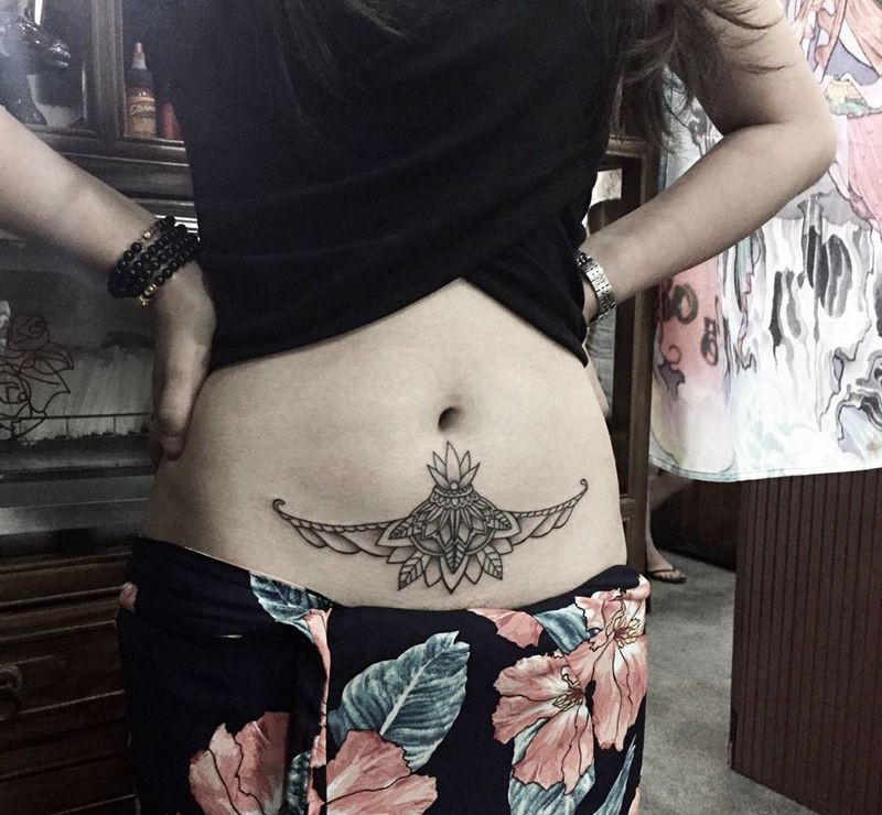 产后印记遮盖纹身图片_成品腰部腹部传统清新欧美图腾几何字符呀呀刺青纹身图案