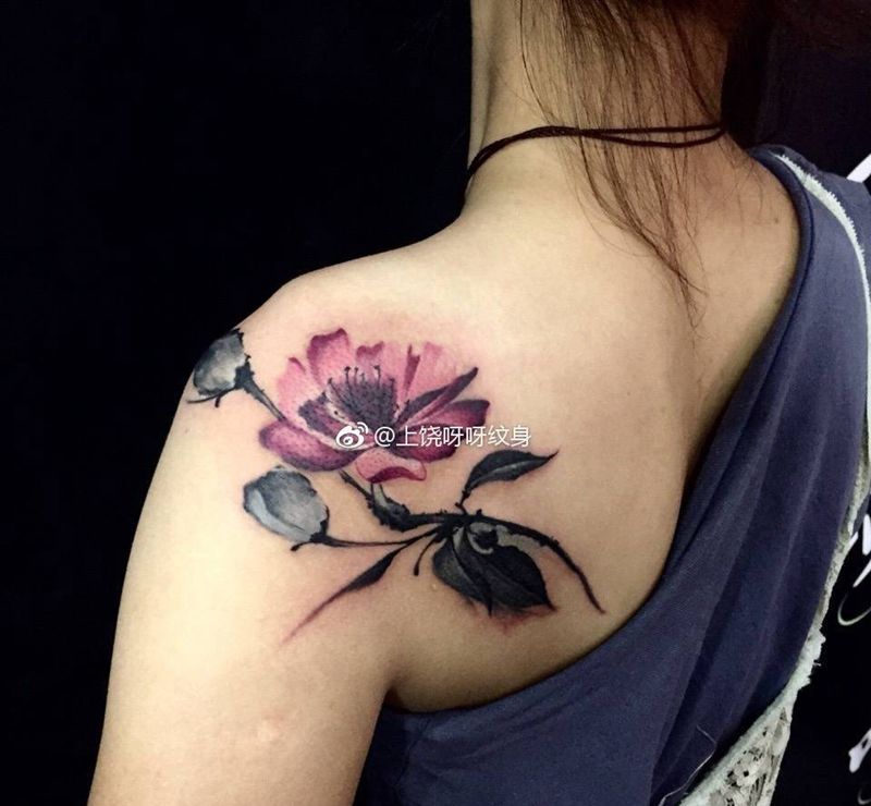 海棠花纹身图片_成品背部肩部传统国画清新植物呀呀刺青纹身图案