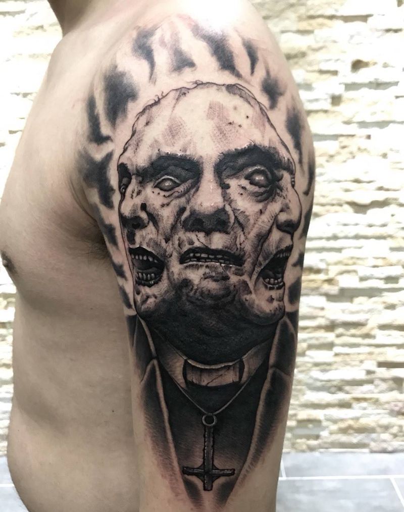 三面神父纹身图片_成品手部手臂欧美人物纹身图案