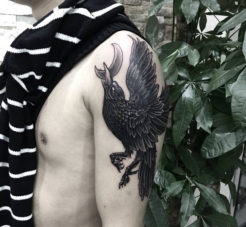 当前位置: 首页 >江西省上饶市纹身店-呀呀刺青纹身图案>乌鸦纹身图片_成品手部手臂欧美动物纹身图案