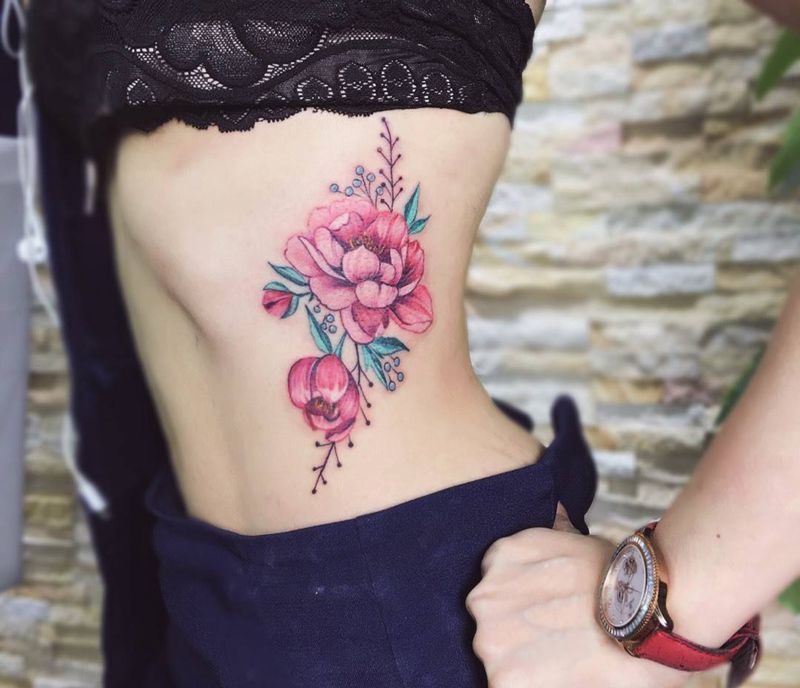 腰侧彩色花束纹身图片_成品腰部腹部清新传统欧美植物动物静物纹身图案