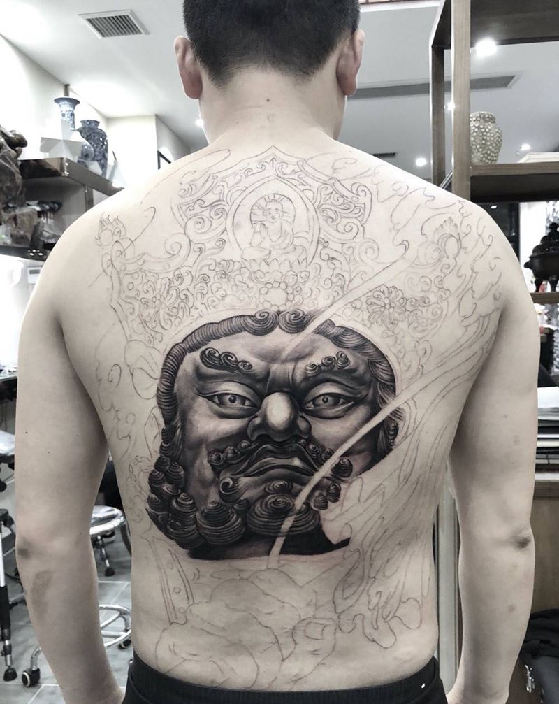 当前位置: 首页 >江西省上饶市纹身店-呀呀刺青纹身图案>满背 连续更新纹身图片_成品背部传统写实欧美肖像鬼神人物宗教纹身图案