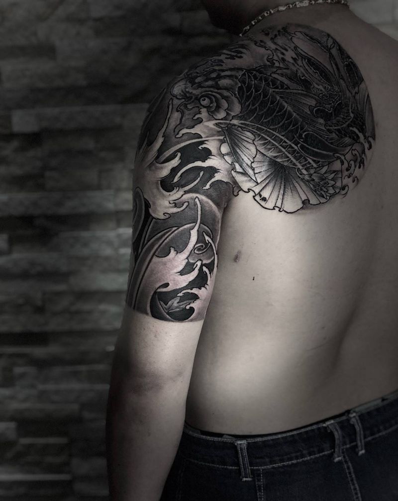 当前位置: 首页 >江西省上饶市纹身店-呀呀刺青纹身图案>后半甲 浪鱼纹身图片_背部手臂传统原创成品纹身图案