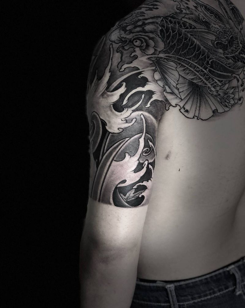 当前位置: 首页 >江西省上饶市纹身店-呀呀刺青纹身图案>后半甲 浪鱼纹身图片_背部手臂传统原创成品纹身图案