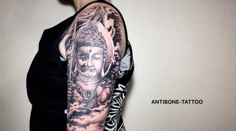 当前位置: 首页 >山东省济南市纹身店-反骨刺青纹身工作室纹身图案># 佛,魔#纹身图片_成品手臂传统鬼神黑白反骨刺青纹身图案
