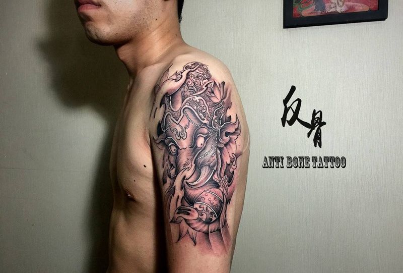 当前位置: 首页 >山东省济南市纹身店-反骨刺青纹身工作室纹身图案>象神纹身图片_成品手臂腿部传统鬼神人物动物黑白纹身图案
