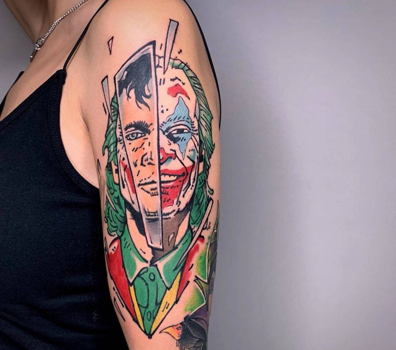 当前位置: 首页 >山东省济南市纹身店-反骨刺青纹身工作室纹身图案>#小丑#美漫风格纹身图片_手臂New School水彩小丑纹身图案