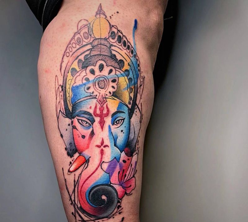 #象神#纹身图片_腿部水彩水墨象神纹身图案