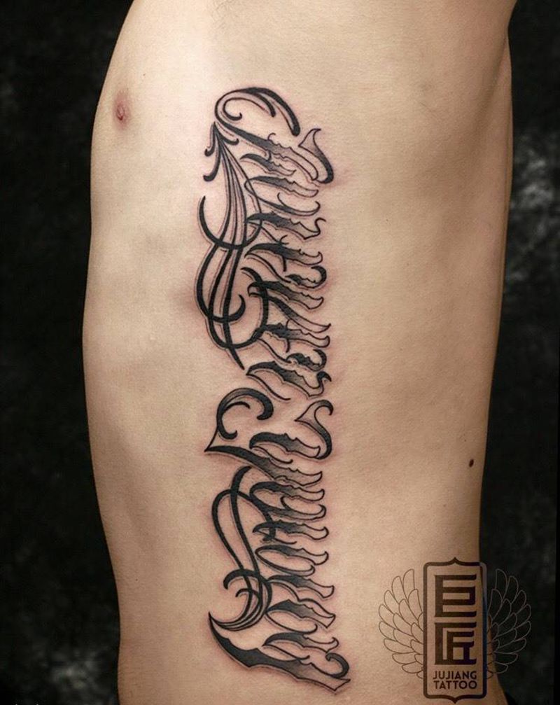 当前位置: 首页 >山东省济南市纹身店-济南巨匠刺青纹身图案>肋部花体字纹身图片_成品欧美字符原创培训纹身图案