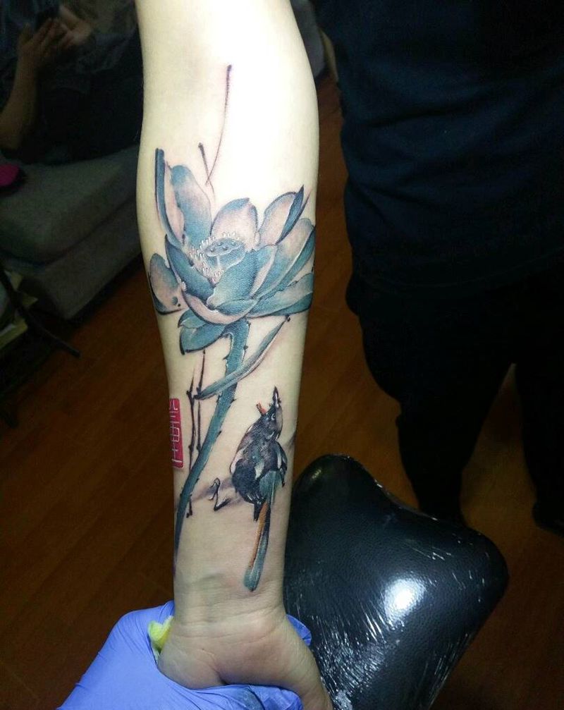 当前位置: 首页 >山东省济南市纹身店-济南皇家烈焰刺青纹身图案>中国风莲花小鸟纹身图片