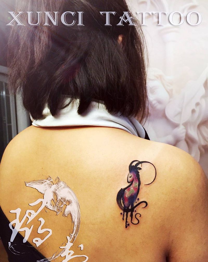 当前位置: 首页 >山东省济南市纹身店-倧玥刺青纹身图案>摩羯座♑️纹身图片_成品肩部背部清新原创鬼神动物宗教欧美国画纹身图案