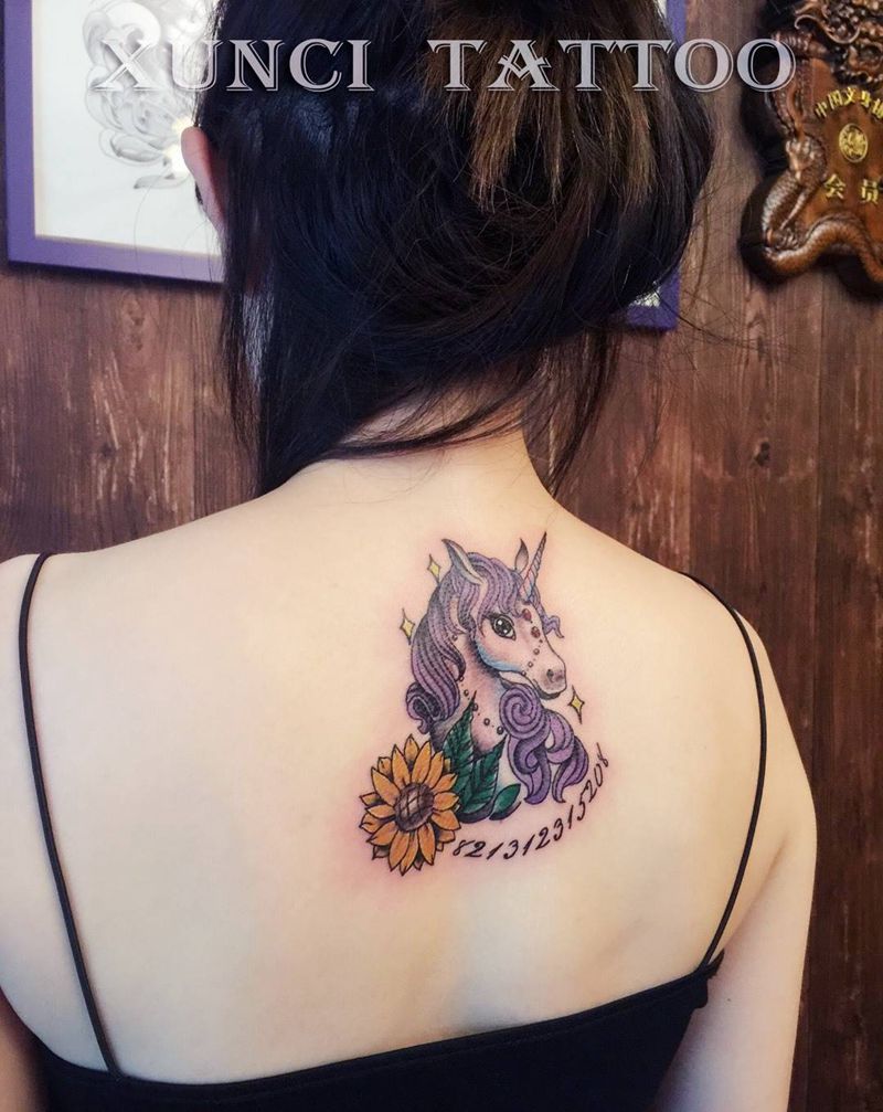 独角兽纹身图片_成品背部颈部欧美清新动物静物字符写实肩部纹身图案