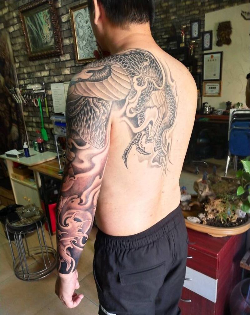 当前位置: 首页 >山东省济南市纹身店-济南老男孩刺青纹身图案>过肩龙加花臂纹身图片_肩部纹身图案